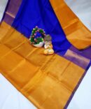 This is a majestic silk saree with a bold contrast combination, pure handloom saree, The saree features a rich dual-tone body in deep golden yellow with blue combination, giving it a lustrous, elegant finish.